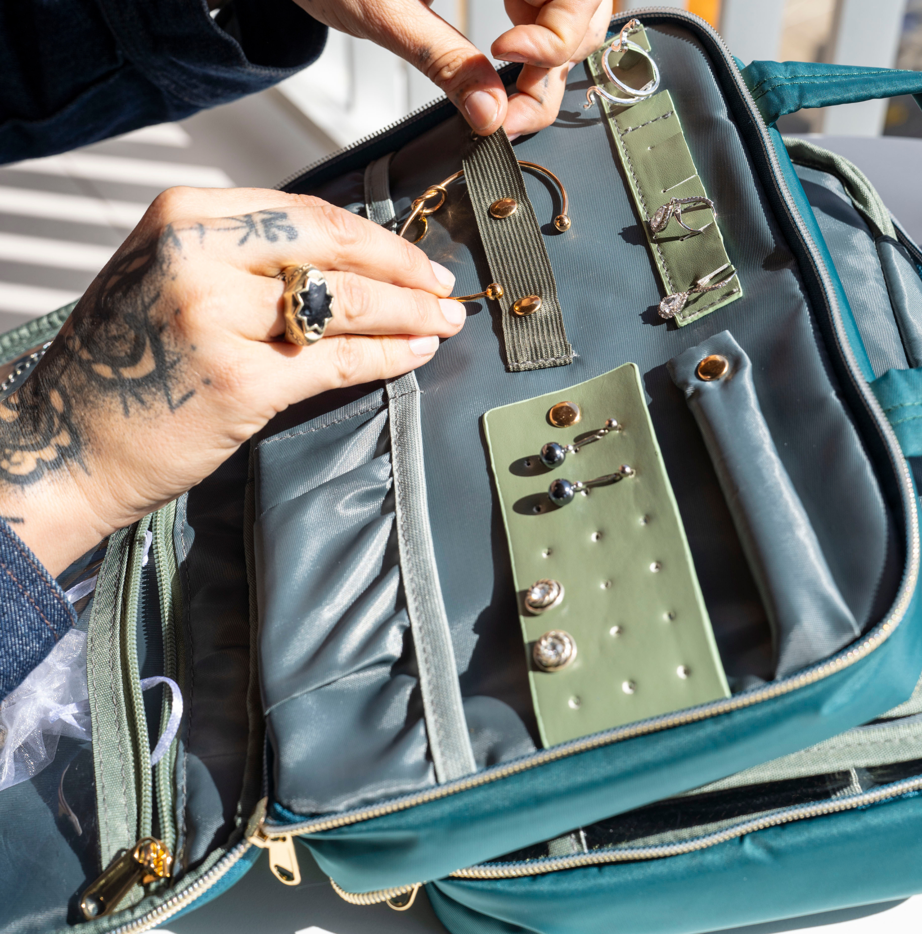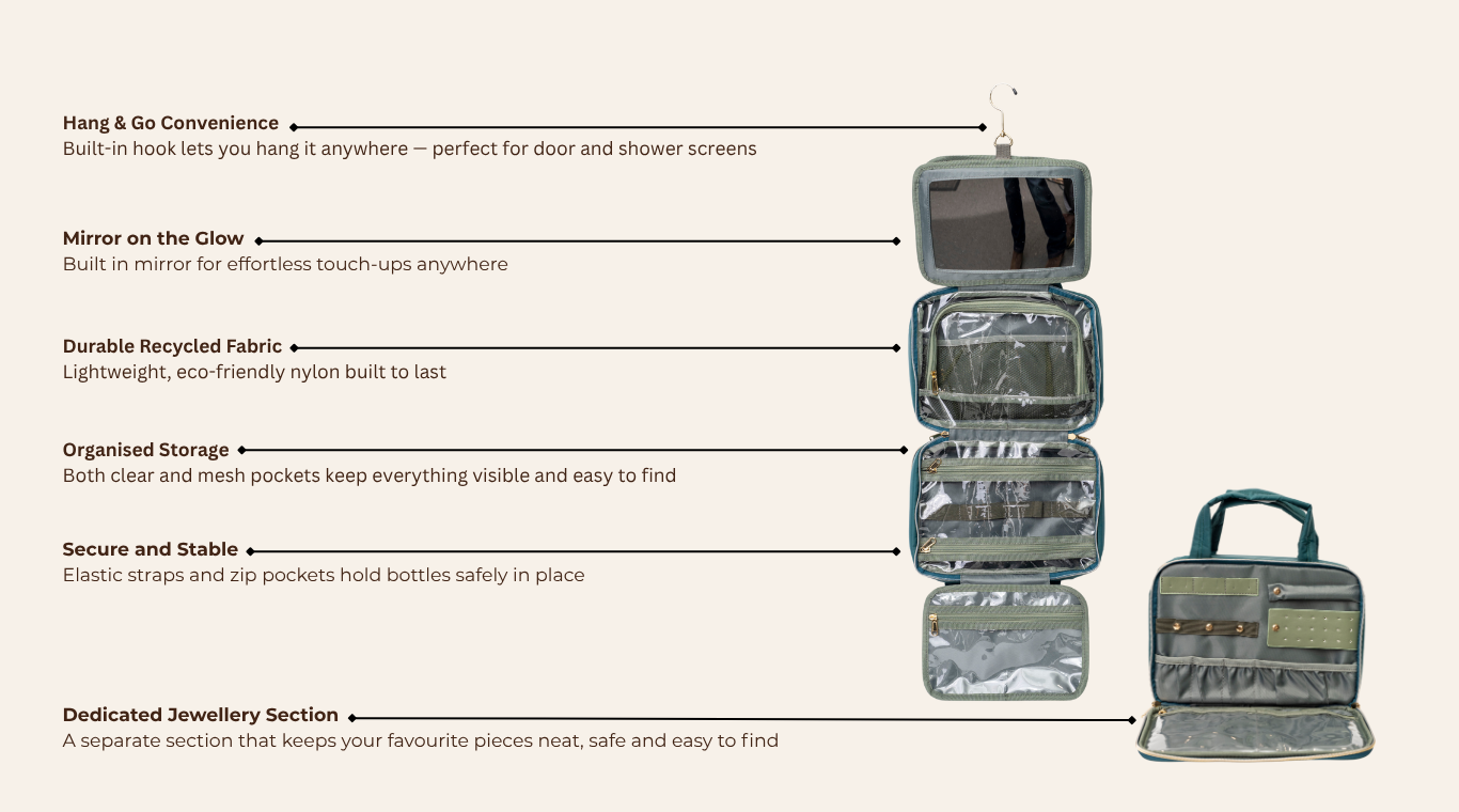 Stay effortlessly composed wherever you go. With its clever hanging design and built-in mirror, the On-the-Glow Case transforms any space into your own personal vanity. Everything stays visible, organised, and within reach — helping you get ready feeling calm, confident, and completely put-together.